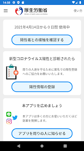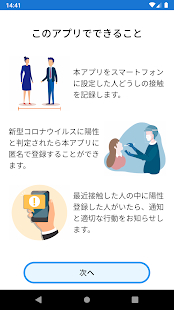 ■できること本アプリを端末(Android、iOS)に設定した人どうしの接触(1m以内、15分以上)を記録します。新型コロナウイルスに陽性と判定されましたら本アプリに匿名で登録することができます。最近接触した人の中に陽性登録した人がいましたら、通知と適切な行動をお知らせします。